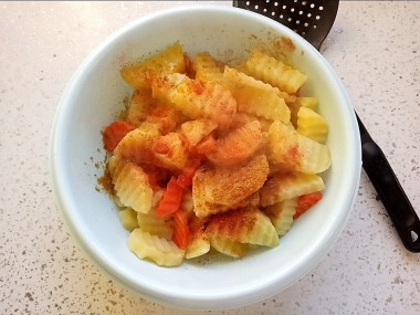 Тушки промыла, обсушила и присыпала солью и щепоткой свежемолотого черного перца. Убрала на час в холодильник, прикрыв пищевой пленкой. В это время почистила картошку и морковку (от себя добавила). Нарезала овощи фигурным ножом, добавила паприку, специи для картофеля и перемешала.