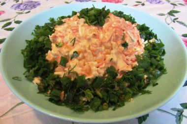 Салат Изабелла с корейской морковью можно охладить либо подавать сразу. Приятного аппетита!
