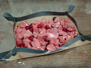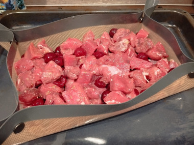 В подходящую форму для запекания выложите мясо и вишню вместе с мясным соком. Можно все выкладывать вперемешку, а можно слоями. Я делала вперемешку.
