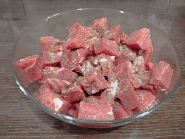 Мясо порезала небольшими кусочками, выложила в глубокую чашку. Добавила соль,перец и орегано. Перемешала и оставила на 20 минут.