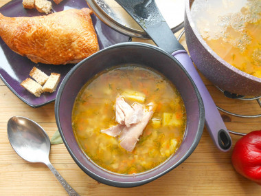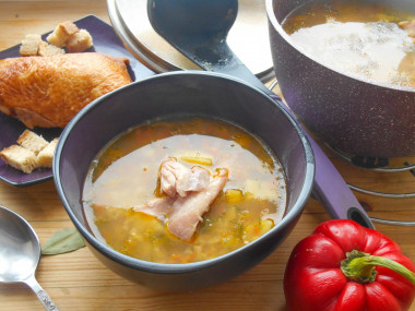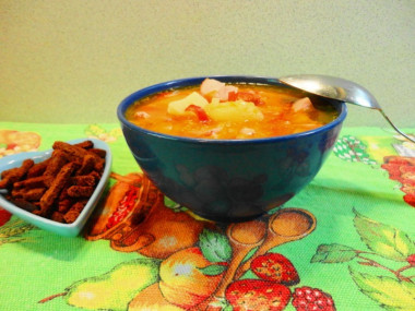 Огромное спасибо за рецепт горохового супа с копченой курицей! Никогда ещё я не готовила гороховый суп с болгарским перцем. Оказалось, очень вкусно! Подавала суп с сухариками.
