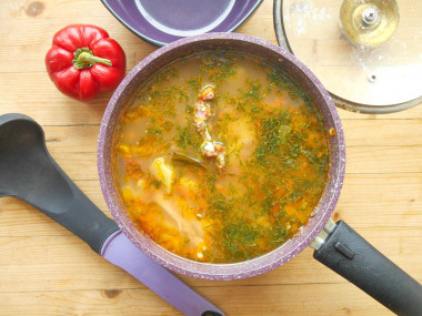 Затем выньте из супа кости и добавьте зажарку и нарезанное мясо. Посолите по вкусу. Вы также можете добавить свои любимые специи и лавровый лист. Проварите суп на небольшом огне еще 10 минут, затем накройте кастрюлю крышкой, огонь выключите и дайте блюду постоять 10 минут.