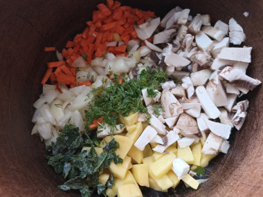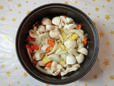 Все ингредиенты залейте водой. В количестве воды ориентируйтесь на желаемую густоту готового супа. Воды можно добавить немного меньше, а потом по необходимости добавлять еще. По вкусу подсыпьте немного соли и специи. Специи выбирайте на свой вкус. У меня немного паприки и специи для грибных блюд. Для аромата можно еще добавить сушеные травы или хмели-сунели. Включите мультиварку на режим "Суп" на 40-50 минут. Ориентируйтесь по своей мультиварке.