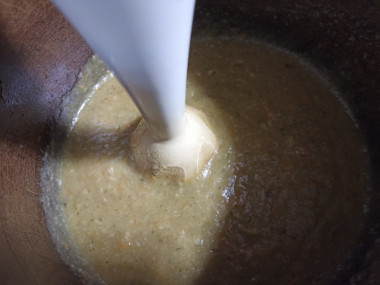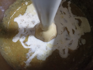 Когда все ингредиенты сварятся, добавьте чеснок и измельчите все до состояния пюре. Влейте сливки. Жирность может быть любой. Чем выше жирность, тем сливочнее будет вкус. Доведите до кипения. На этом этапе можно подлить немного воды.
