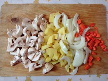 Шампиньоны нарежьте ломтиками, а картофель кусочками. Форма нарезки не имеет значения, так как потом все будет измельчаться. Нарезанный картофель и грибы отправьте в чашу мультиварки.