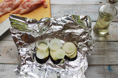 Один из вариантов запеченной в фольге куриной грудки. Класс! Куриные грудки с баклажанами в духовке - просто и сытно. Запекается грудка сразу с овощами. Это и гарнир, и основное блюдо одновременно. Результат - экономия времени и эффектная подача! Спасибо за рецепт!