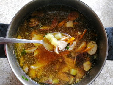 В конце приготовления добавьте в суп зажарку и лавровый лист (по желанию его можно добавить в начале варки), дайте покипеть ещё 2-3 минуты и снимите кастрюлю с огня. Пусть суп настоится некоторое время.