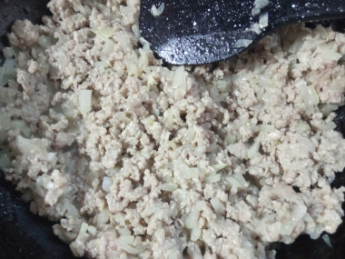 К обжаренным луку и чесноку добавьте фарш. Я взяла замороженный фарш и не стала его размораживать. Он великолепно разморозился прямо на сковороде. В общем, если у вас фарш тоже замороженный, то можете смело поступать так же как и я. Это значительно сэкономит время.