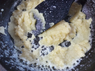 Добавьте в него муки и хорошенько перемешайте, удобно это делать силиконовой лопаткой. Получится такая густая паста. Жарьте ее постоянно помешивая минуток пять, не больше.
