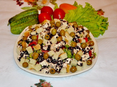 Необычная версия греческого салата. Салат очень вкусный, яркий, нарядный, аппетитный и ароматный. Все составляющие замечательно сочетаются и дополняют друг друга.