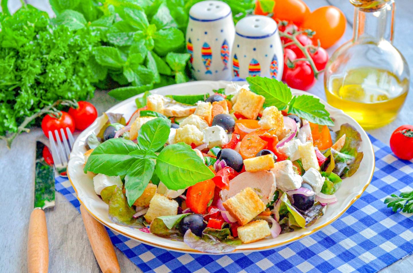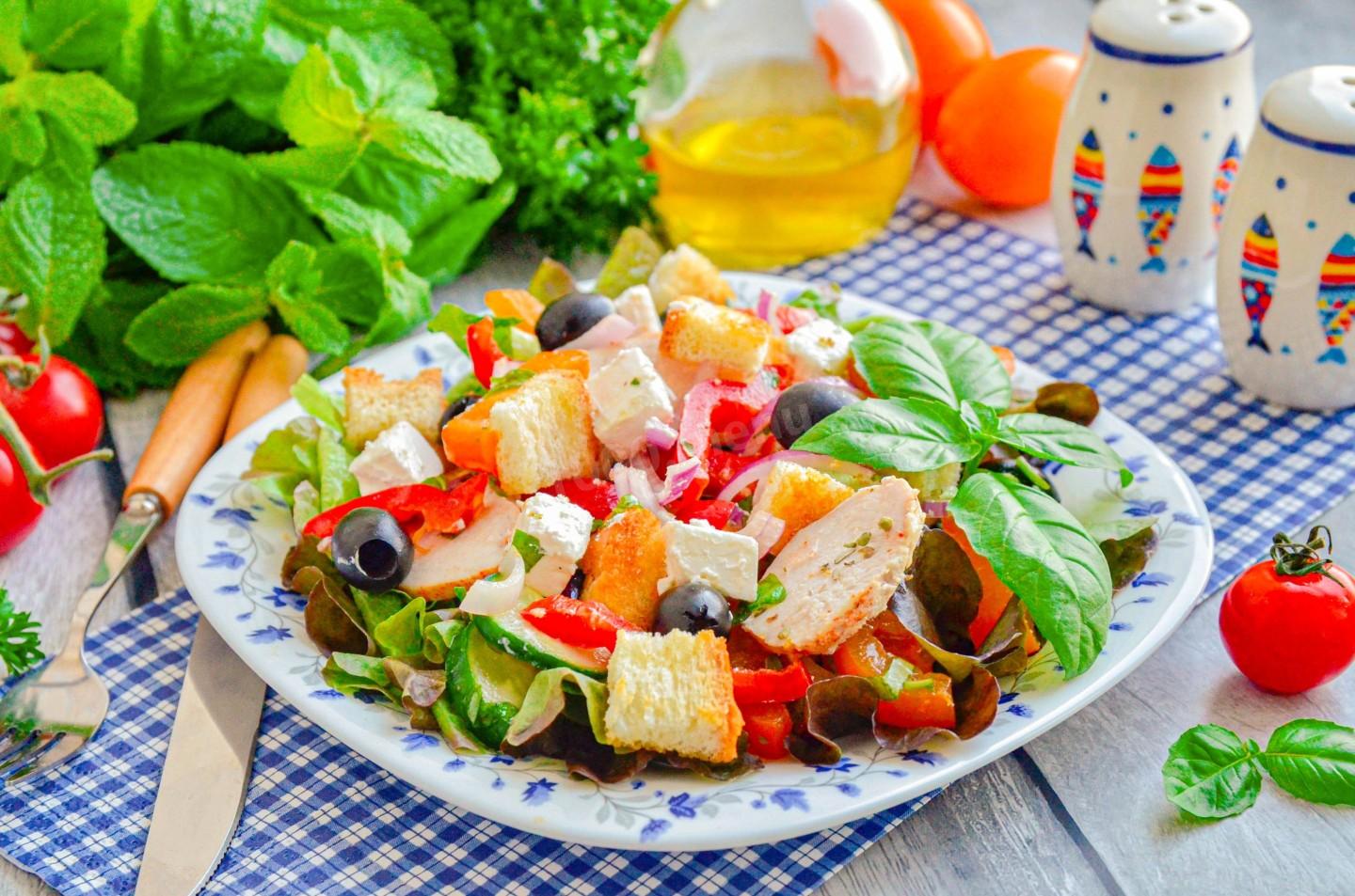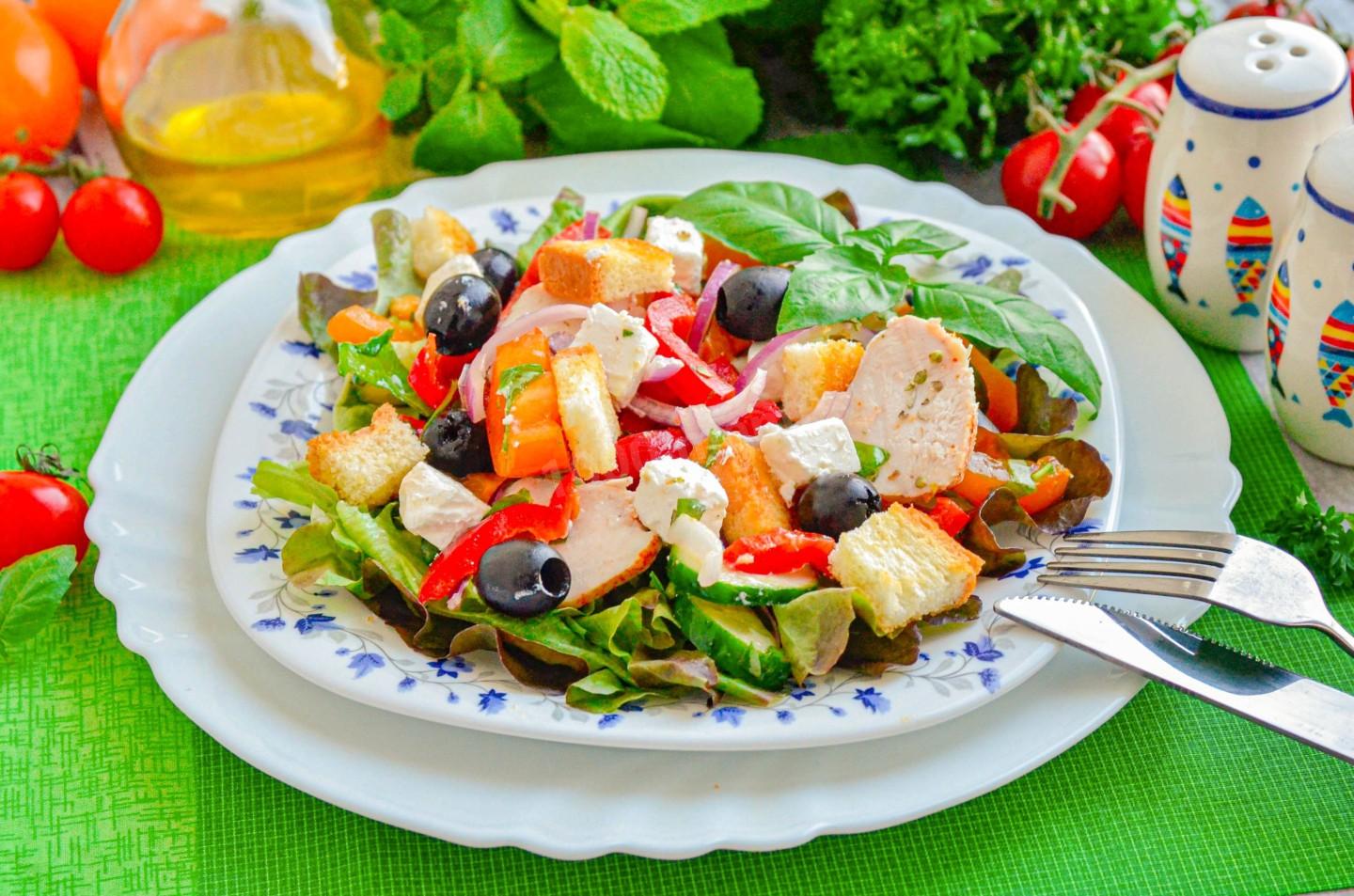Этот греческий салат с курицей и сухариками — пример сбалансированного питания. Свежие овощи — источник клетчатки и витаминов, запеченное куриное филе — полезный белок для мышц, а оливковое масло в заправке содержит необходимые жирные кислоты. Брынза или фета дают кальций, а домашние сухарики из белого хлеба — энергию.