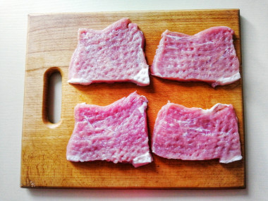 Каждый кусок мяса необходимо отбить. Для этого положите мясо на доску, накройте пищевой пленкой и отбейте с помощью кулинарного молотка. Для чего накрывать мясо пленкой? Это необходимо для того, чтобы при отбивании не летели брызги от мяса и чтобы мясо не рвалось по краям.