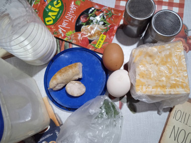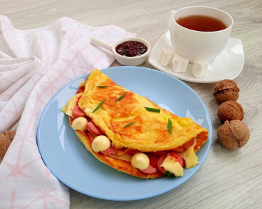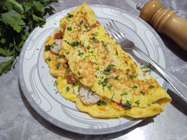Приготовила омлет по этому рецепту. Взяла куриную колбаску, мраморный сыр, свежую петрушку. Порезала для начинки продукты. Яйца взбила с молоком и мукой. Обжарила яичный блинчик. Переворачивала двумя лопатками и все равно он у меня порвался. Омлет очень нежный. Но я его сложила на сковороде, выложила начинку и накрыла целой частью омлета. Готовила под крышкой, чтоб сыр расплавился. При подаче ещё посыпала свежемолотым перцем и зеленью. Очень красивый омлет получился, не смотря на то, что немножко порвался) Интересно, когда начинка не полностью закрыта и выглядывает, что вызывает аппетит. Омлет сытный завтрак на скорую руку и это правда. Очень вкусно, ароматно и сытно. Отличное сочетание яиц с колбасой, сыром и кетчупом. Это нежно и аппетитно. Настоящий заряд бодрости! Замечательный рецепт! Благодарю автора!