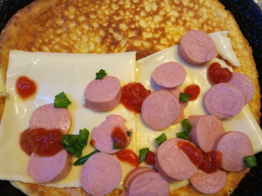 Аккуратно переверните омлет широкой лопаткой. Он очень нежный и может порваться, но это не страшно, потом его можно сформировать обратно. Выложите на одну половинку кусочки колбасы (сосисок), сыра, ложечкой выложите кетчуп в промежутках между ними. Вы также можете использовать майонез вместе с кетчупом. Посыпьте начинку измельченной зеленью.