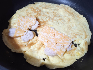 Пышный омлет с молоком и колбасой на сковороде
