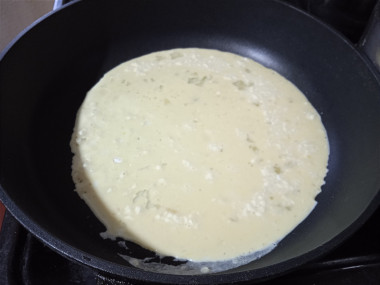 На плите на небольшой огонь поставьте разогреваться сковороду. Советую вам жарить на одной сковороде сразу только одну порцию — слишком большой омлет вы не сможете перевернуть. Соответственно и сковороду выбирайте небольшого диаметра — 17-18 см. Для нескольких порций лучше использовать пару сковородок или жарить их друг за другом. Налейте на сковороду немного масла, размажьте его. Вылейте на сковородку яичную массу.