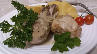 Обжаренный лук и чеснок, добавила в кастрюлю к курице и влила стакан белого вина. Сверху посыпала специями и зеленью, закрыла крышку и готовила на медленном огне. Курица в вине, также выделила свой сок, который с вином, превратился в прекрасный соус.