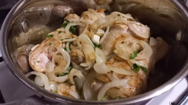 Обжаренный лук перекладываем сверху на курицу и вливаем в кастрюлю вино.