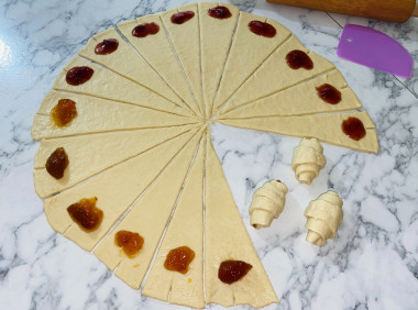 После раскатки сразу же формируются круассаны 🥐, с начинкой из варенья двух сортов, урючное и клубничное. У автора вареная сгущенка, но написано, что можно и варенье. Смазала сформированные круассаны 🥐 и в духовку.