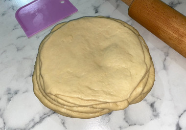 Последнюю, верхнюю, смазывать не нужно. Получится вот такая стопка смазанных лепешек.