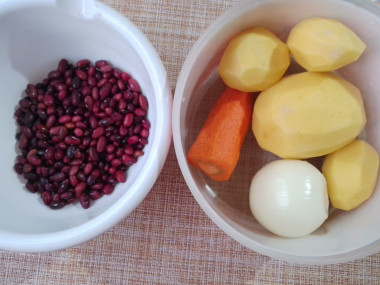 Как сделать суп из бобов постный? Подготовьте ингредиенты. Промойте хорошенько бобы и замочите их в холодной воде 1:3. Я замачивала их на всю ночь. Они увеличились в объеме примерно в 2,5 раза.