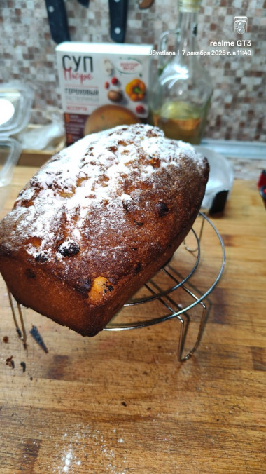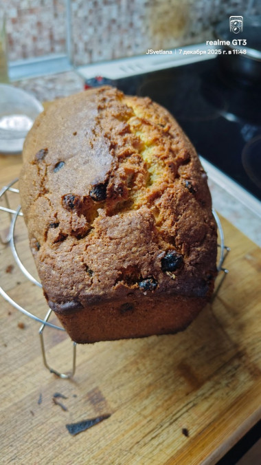 Готовила заменив масло на маргарин и добавила 250 гр изюма. И форма была немного другая. Какой был вкусный. Умяли вдвоем за один присест))
