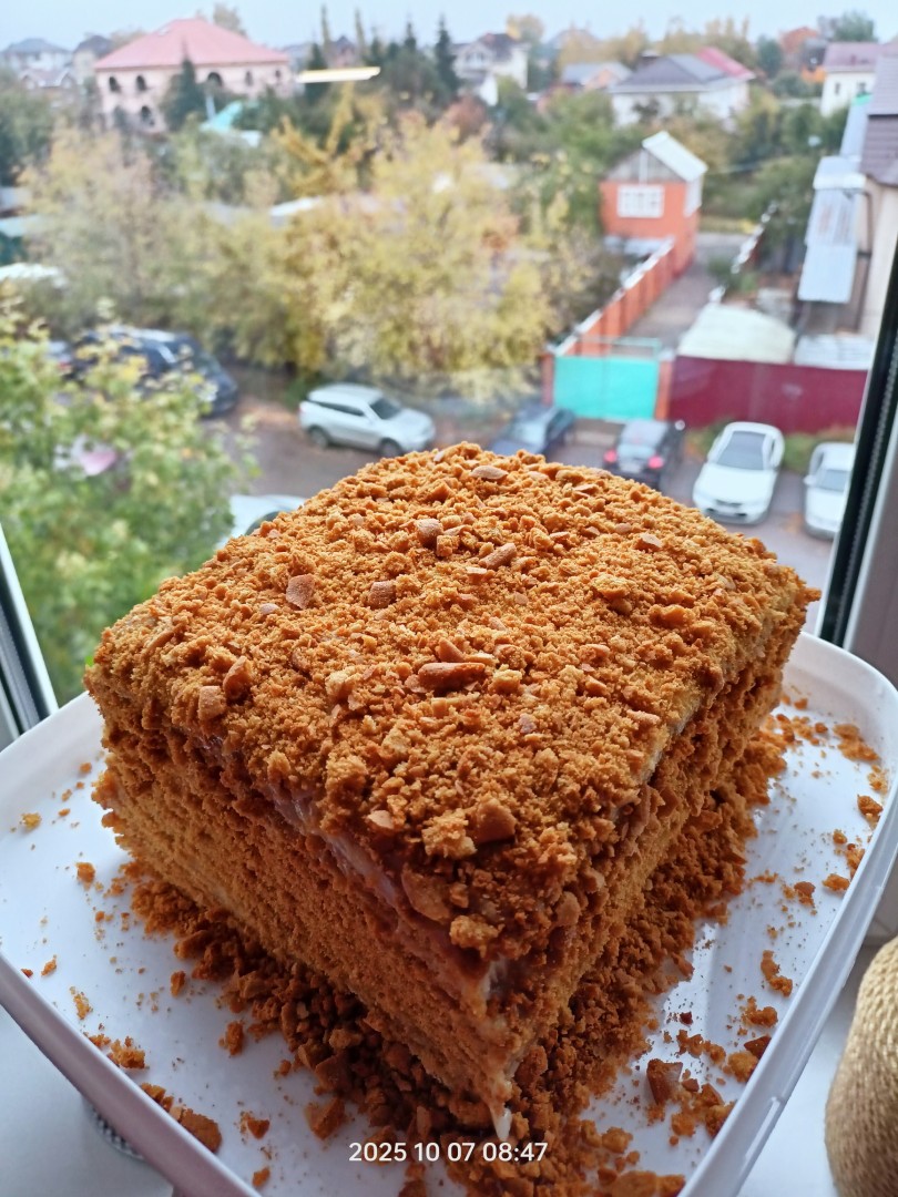 Собираем торт. Обмазываем коржи, верх и бока торта кремом. Из обрезков делаем крошку. Обсыпаем торт крошкой. Убираем на 4 часа в холодильник.