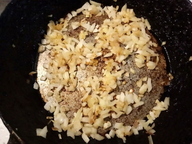Оставшиеся масло и сок от обжаривания котлет можно использовать для приготовления соуса. Выложите на сковороду нарезанный репчатый лук. Обжарьте лук на умеренном огне при помешивании до прозрачности и мягкости.