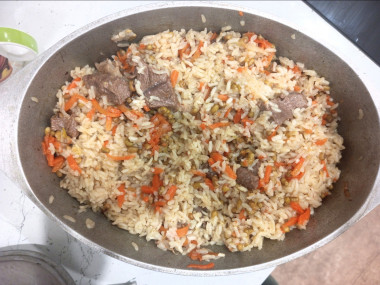 Люблю готовить плов по разным рецептам, и мне нравится то, что каждый раз узнаешь что-то новенькое для себя. Плов с нутом пробовала всего лишь один раз и он мне понравился. Сегодня у меня на ужин плов и я нашла этот рецепт. Все бы хорошо, но нута в доме не оказалось. Зато был маш, который я когда-то купила специально для плова. Решила сделать замену, так как оба этих продукта относятся к бобовым и кладутся в плов. Маш замочила в воде на несколько часов, а тем временем приготовила все остальное. Из мяса у меня кусочек свежей говядины весом 600 граммов. Моркови я обычно кладу не больше двух, но на этот раз взяла по рецепту. По весу у меня получилось три морковки. Лук тоже взяла по весу. Мне понравился лайфхак про луковицу, поджаренную в растительном масле для определения начала готовки мяса. Все делала по рецепту. Автор рецепта очень подробно и грамотно описала процесс приготовления плова. Из приправ я исключила зиру. Я знаю, что она является обязательной приправой к плову, но мне не нравится ее аромат, поэтому я заменила ее на сухую аджику, которую я просто обожаю. Плов у меня получился рассыпчатый и вкусный - мне понравился. А вот мои родные не оценили маш в плове. Сказали, что надо было готовить без него. Думаю, что с нутом вкус плова лучше. Но сам рецепт замечательный.