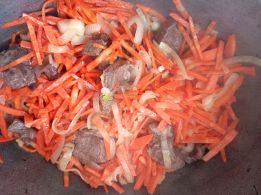 Не убавляя огонь, добавьте в казан с мясом и луком морковь и обжаривайте её в течение 10 минут до мягкости (при надавливании краем шумовки на кусочек моркови, мы можем его легко разделить).
