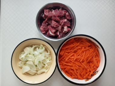 Нарежьте крупными кубиками мясо. Нарежьте овощи крупно: лук кольцами толщиной 0,5-0,8 см, морковь - соломкой толщиной 0,5-0,8 см, длиной - 4-5 см.