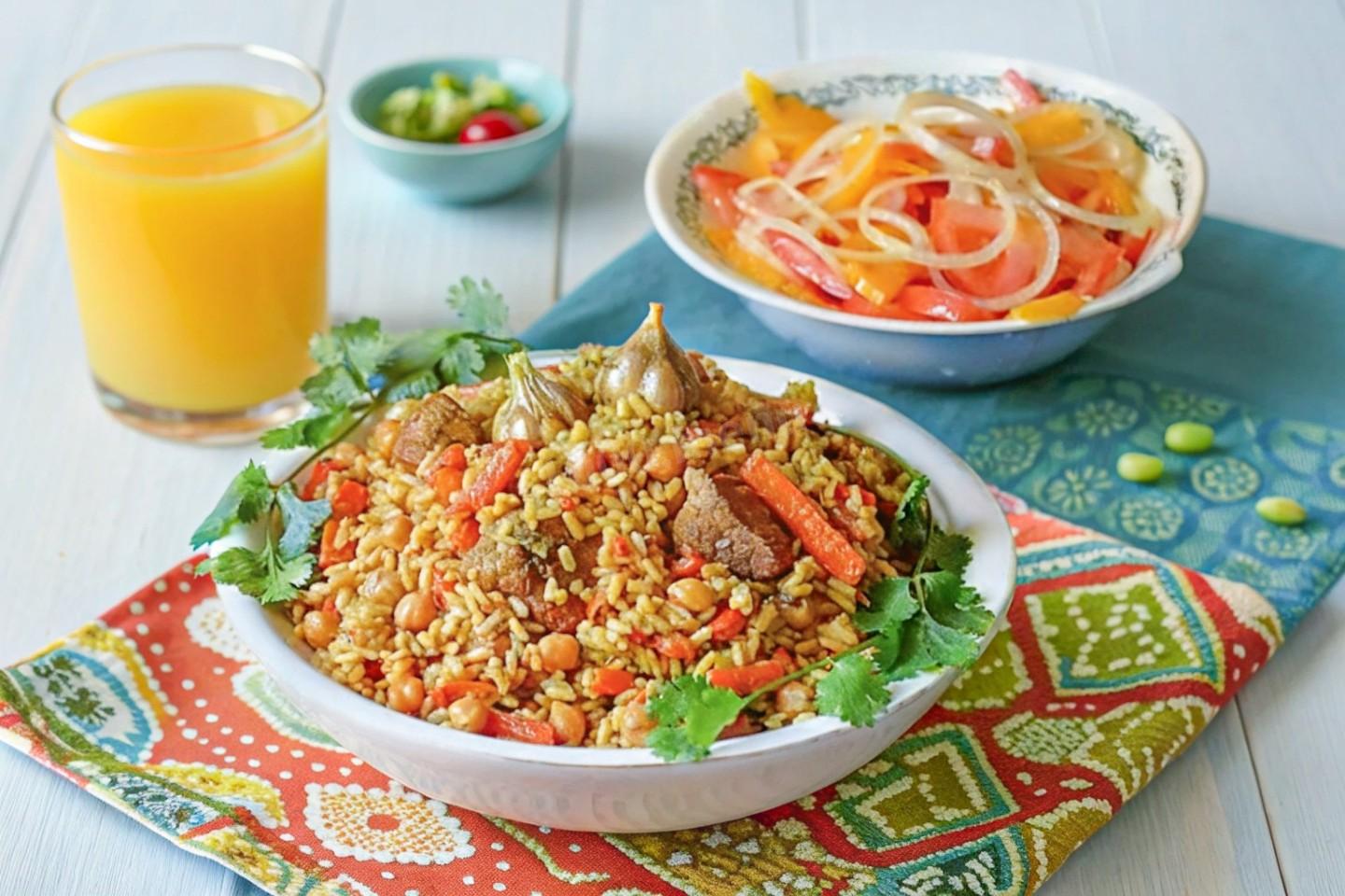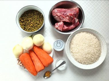 Калорийность продуктов: Баранина, Рис, Морковь, Лук репчатый, Растительное масло, Нут, Чеснок, Куркума, Зира, Перец красный молотый, Соль