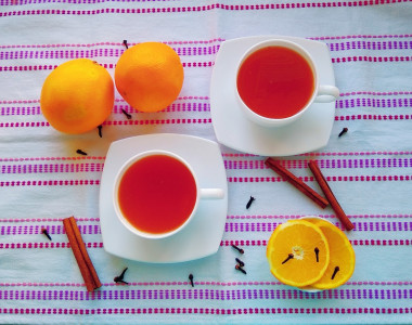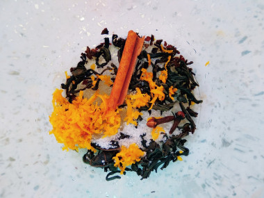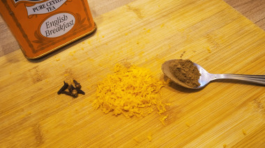 Приготовим ингредиенты по списку: черный листовой чай без вкусовых добавок, апельсин, сахар (если нет аллергии по вкусу сахар можно заменить медом), корицу, гвоздику. По вкусу можно добавить такие компоненты как имбирь, мускатный орех для получения более пикантного привкуса и согревающего эффекта.