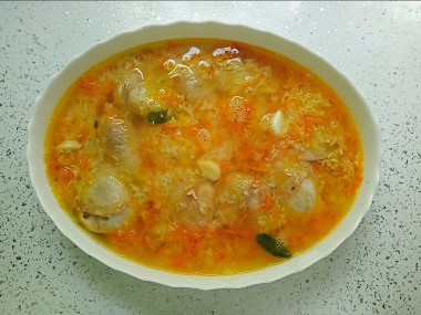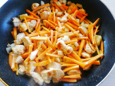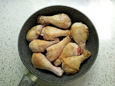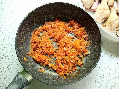 Курица у меня в виде ножек, которые заранее разморозила в холодильнике. Обжарила их на сильном огне, чтобы схватилась корочка. На той же сковороде слегка обжарила лук и морковь.