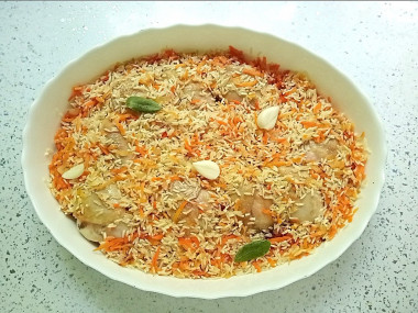 Мы с мужем очень любим плов, поэтому, увидев на сайте рецепт плова в духовке с курицей, начала его готовить. Взяла куриную грудку, нарезала, обжарила на растительном масле до румяной корочки. Затем добавила в сковородку лук и морковь, жарила всё вместе 5 минут. Потом выложила мясо с овощами на противень. Сверху положила промытый рис (у меня был круглозерный), чеснок, посолила, залила всё горячей водой и поставила противень в духовку.