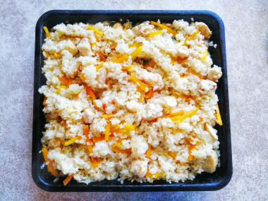 В подготовленную форму для запекания выложите обжаренную курицу и овощную зажарку. Для запекания берите глубокую форму, так как рис в процессе готовки увеличится в объеме. Форма может быть керамической, стеклянной или металлической. Форму предварительно смазывать маслом нет необходимости, так как в обжаренной курице и овощах уже достаточно масла.