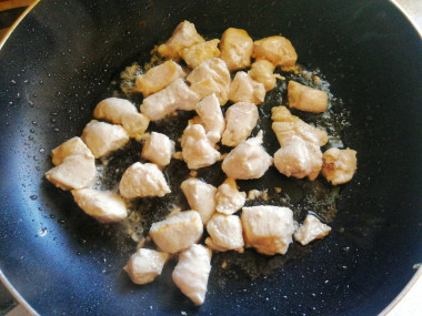 Курицу нарежьте на небольшие кусочки. На горячую сковороду налейте немного растительного масла и выложите курицу. Обжарьте её на сильном огне со всех сторон до золотистой корочки.