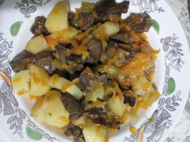 Вкуснейший картофель с куриной печенью для моей семьи. Это жаркое понравилось всем. Приятный вкус нежной печени в сочетании с картошкой и овощами придает неповторимый вкус и аромат этому блюду. Огромное спасибо за рецепт!