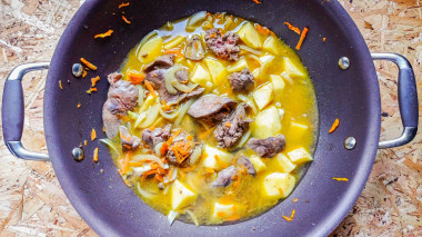 Картофель помойте, очистите и нарежьте на кусочки - я резала одну картофелину на восемь кубиков. Добавьте нарезанный картофель к обжаренной печени с овощами. Долейте горячей воды, чтобы она прикрывала картофель на 2/3. Поставьте тушиться на средней огонь при закрытой крышке минут на десять.