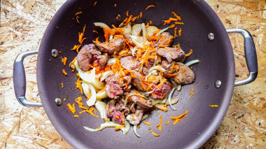 Лук и морковь очистите, измельчите - лук нарежьте, морковь натрите на крупной тёрке. Добавьте овощи к обжаренной куриной печени. Обжаривайте овощи с печенью, постоянно помешивая 7 - 10 минут.