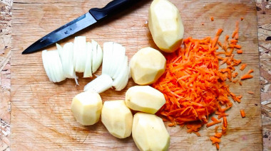 Как сделать картофель с куриной печенью? Подготовьте продукты. Куриную печень лучше брать свежую. Картофель выбирайте тех сортов, которые во время приготовления держат форму, не развариваются. Лук и морковь среднего размера. Готовить будем на плите, поэтому подготовьте кастрюлю с толстым дном для тушения.