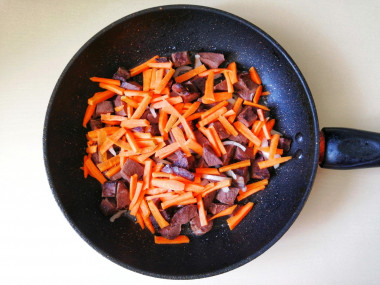 Так как мясо было уже готовое, порезала его на кусочки, немного обжарила на сковороде, добавила лук, морковь, соль и красный перец. По рецепту нужно было положить еще болгарский перец, но у меня его не было.