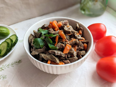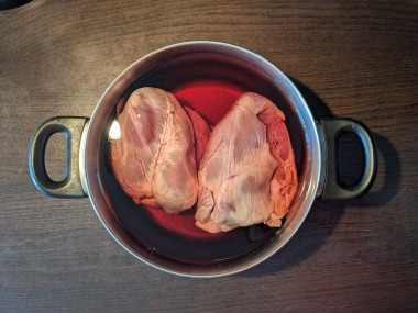 Замороженный субпродукт вымачивала в холодной воде целую ночь (можно вымачивать меньше 1-2 часа). После зачистила от плёнок и сосудов.