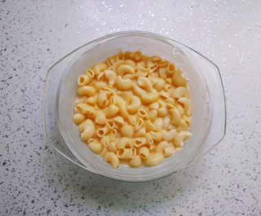 Кастрюлю с холодной водой поставьте на огонь. Как только вода закипит, добавьте соль. Высыпьте сырые макароны в кипящую воду и отварите до готовности соблюдая время рекомендованное в инструкции на упаковке. Как только макароны будут готовы, откиньте их на дуршлаг и дайте стечь жидкости. Включите разогреваться духовку до 180 градусов. Можно также использовать ранее отваренные макароны.