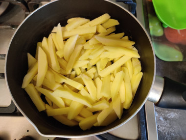Картофель нарежьте длинной тонкой соломкой толщиной 5-7 мм.