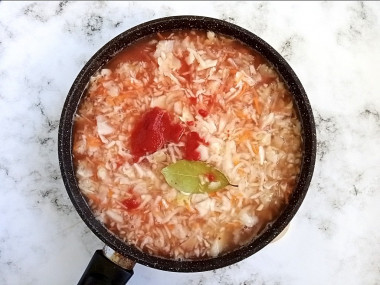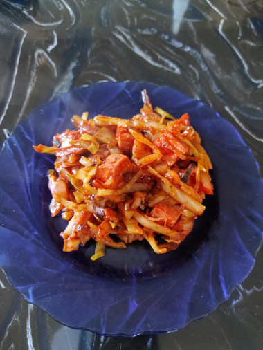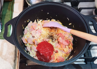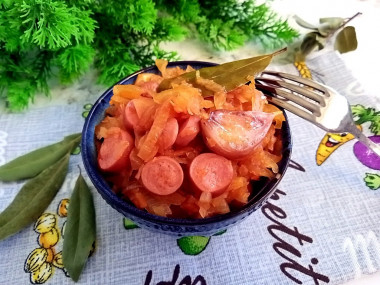 Лук и сосиски обжарила, добавила капусту, томатную пасту, лавровый листочек и залила водой. Тушила под крышкой на слабом огне минут 40. Затем без крышки до испарения жидкости.