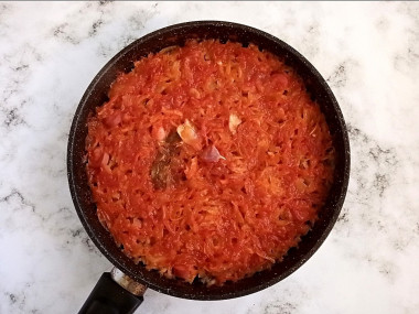 Добавьте к капусте томатную пасту, соль, сахар и молотый перец. Все перемешайте и жарьте все вместе еще около 2 минут. Томатную пасту в этом рецепте можно заменить на измельченные помидоры в собственном соку или томатный кетчуп.