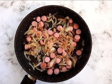 Сосиски очистите от заводской пленки и нарежьте кружочками. Сосиски для блюда можете использовать любые. Но стоит учитывать, что они могут сильно повлиять на итоговый вкус блюда. Например, если возьмете сосиски с ярко выраженным копченым вкусом, то и все блюдо у вас тоже будет с легким вкусом копченостей. Если вам нужен нейтральный вкус, берите обычные сосиски, например молочные или сливочные.