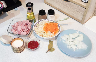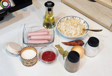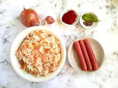 Как сделать тушеную квашеную капусту с сосисками? Для начала подготовьте необходимые ингредиенты по списку. Капусту можете брать магазинную или домашнюю.