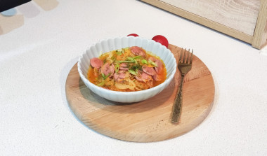 Квашеная капуста с сосисками - это просто замечательный обед! Делается просто и быстро, а сочетание продуктов получается очень удачным. В этот раз я не стала добавлять морковку, чеснок и томатную пасту. Сделала, так сказать, облегченный вариант))) Семье понравилось!